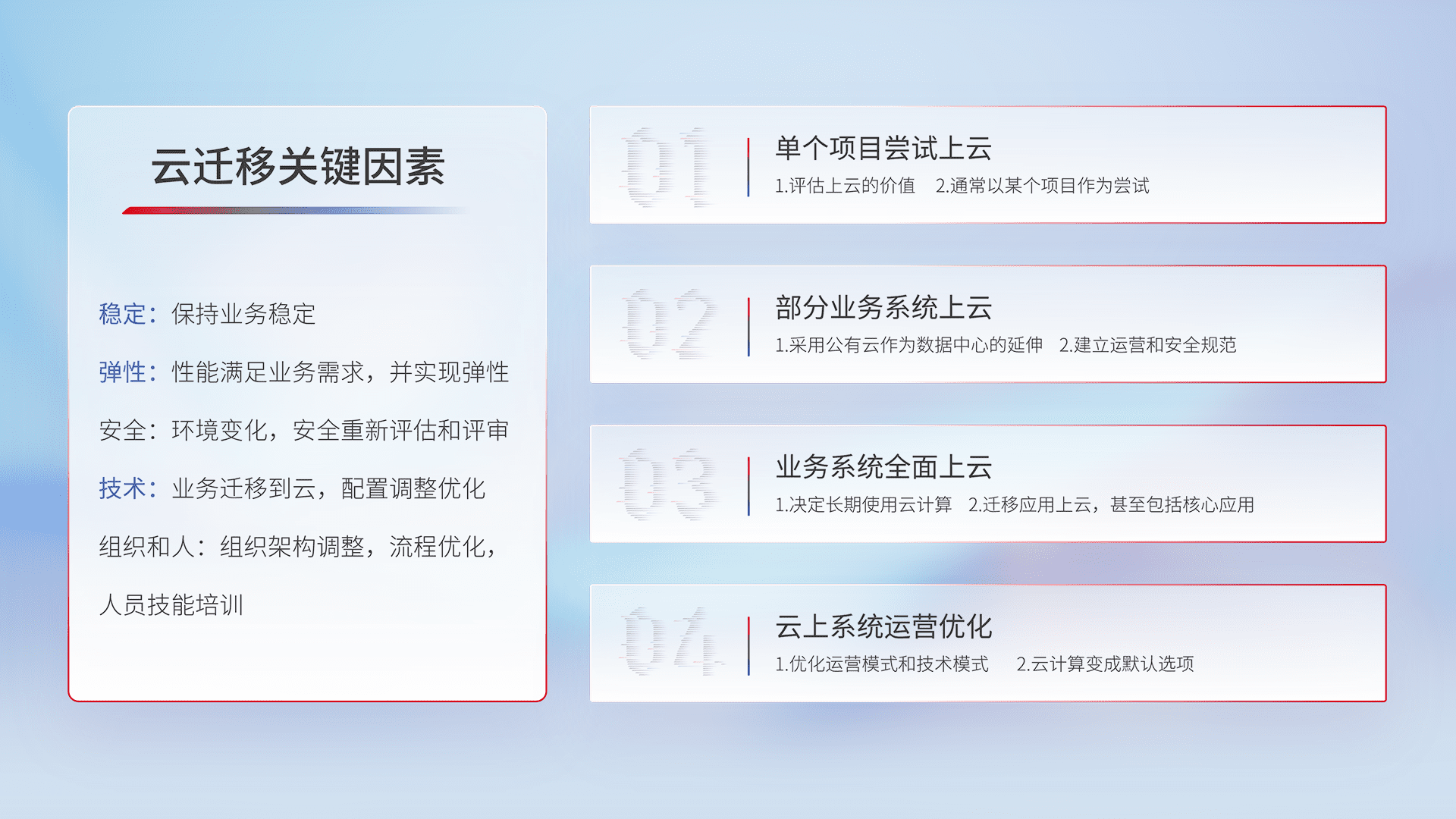 结合实际业务,,,从规划设计、、、云平台选型、、、、云原生改造、、、数据迁移、、、集成交付,,,迁移全过程为客户识别最佳上云路径,,做好风险识别管理,,设计网络架构、、身份权限、、安全审计合规、、、、操作审计、、、日志审计、、监控告警策略、、、多站点容灾设计等,,,,对云上基础设施进行整体规划,,提升IT治理水平,,,,以满足弹性、、、高可用、、、、高性能的需求。。。。