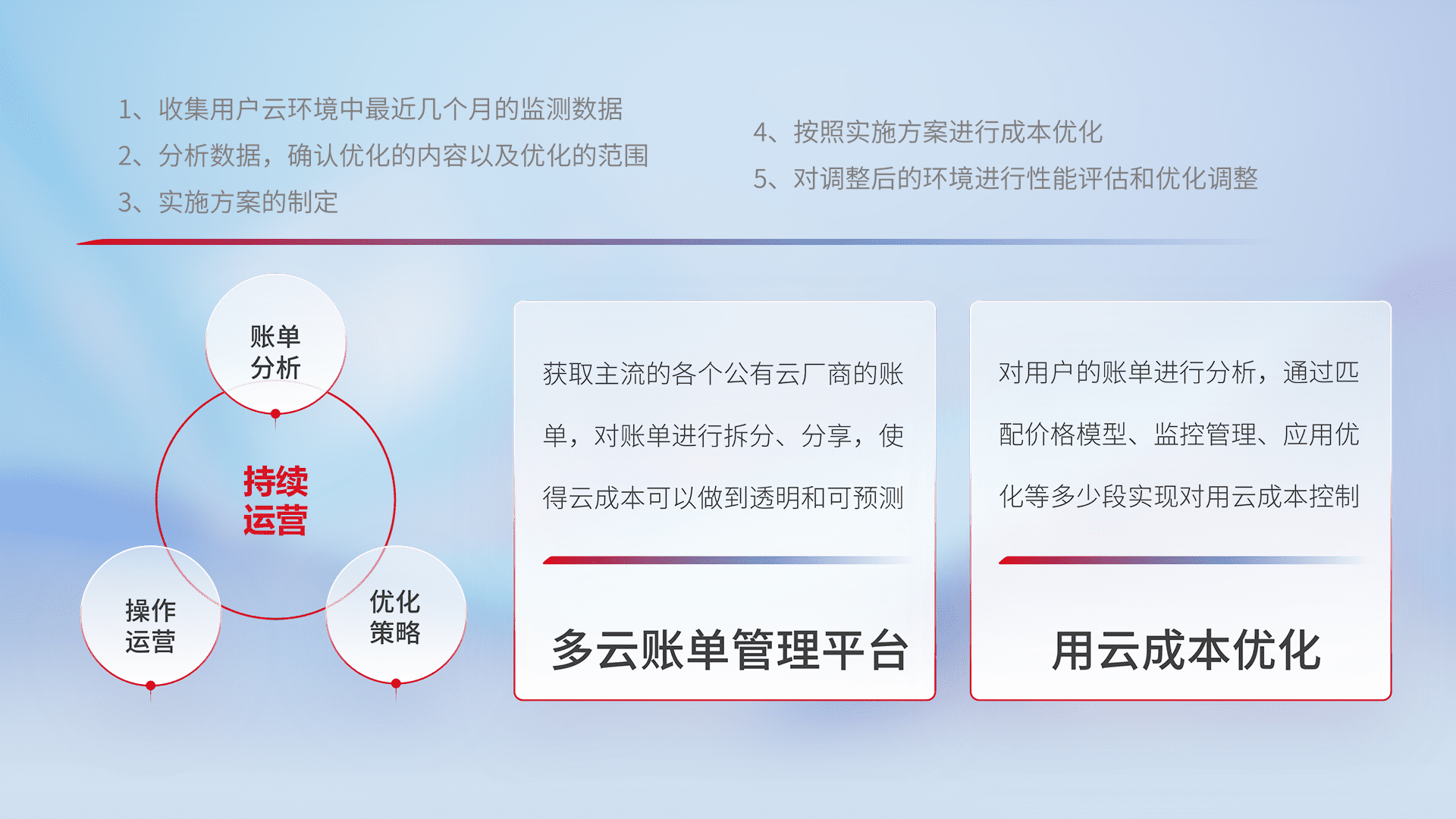 通过多云纳管,,,,以统一的资源数据模型把客户的云资源进行抽象和封装,,进而实现对多云资源的统一操作,,,保障云资源管理的可靠性、、、、稳定性与可用性。。。量身定制化运维内容,,,配置、、、、开发运维、、、、补丁管理、、、备份、、、、监控、、、、认证和访问管理、、、、审计和日常巡检等,,,,保障在用云过程中的可靠度,,稳定度以及高可用率。。。